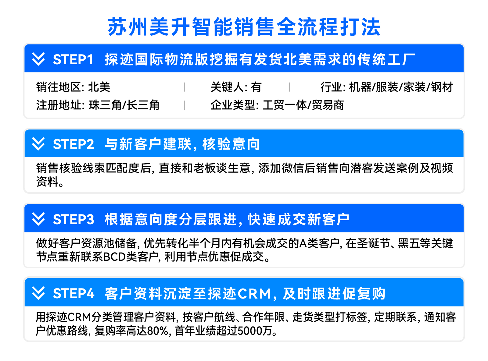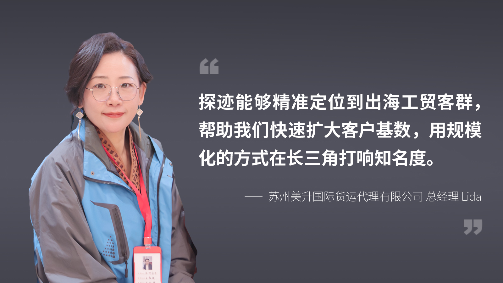 商,业的本质是价值共振,需要供需两端同频共创。苏州美升选择合作企业时较为谨慎,除了在探迹物流版上提前确定对方的走货线路、货物性质、企业规模、出口数量外,销售在联系客户前还会重点查看对方有无不良记录、账期风险,跨境电商类会重点观察潜在客户的网站销量情况,确保优先成交优质客户。目前苏州美升65%的新客户来源于探迹,智能获客驱动营收突破3000万元,旺季营收环比翻倍增长。“快而务实”是他们的信条,按Lida的话来说,“有些老客户就算亏点本也要做。”在保证客户增长速度的同时兼顾服务质量和性价比,也让他们的复购率不断提升。