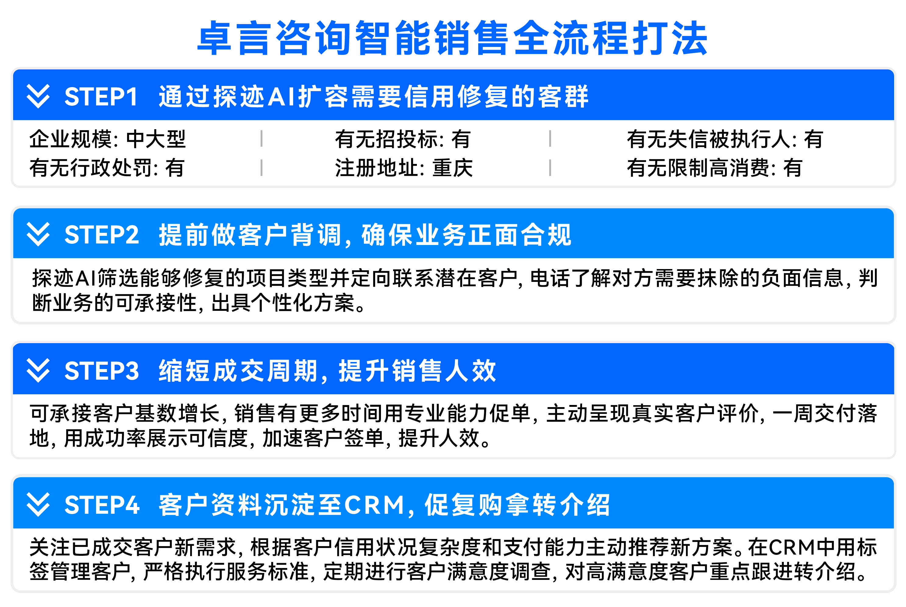 在创业初期,许多企业由于对复杂法规理解不足或精力集中于核心业务,可能在税务申报或法律程序执行中出现疏漏。这些并非源于主观故意违规,但却容易成为历史遗留问题,对企业信用记录产生影响,进而让企业遭遇发展阻碍,而信用修复这一行正是为这些企业提供一个关键的纠错与重塑机会,帮助他们清除非恶意遗留问题,重建市场信任。有一批行业后来者正借助AI精准掘金需要“修复信用”的高价值客群,实现弯道超车,重庆卓言企业管理咨询有限公司正是其中之一。引入探迹AI后,公司不仅实现订单量质双升,更驱动销售团队规模与人效同步跃迁。