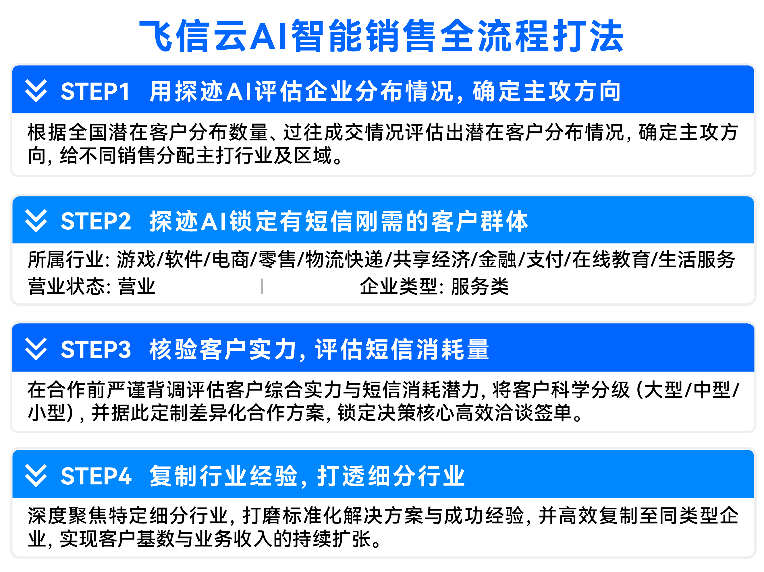 有了这个成功经验,团队试着根据探迹系统中各地区企业类型分布数量、过去成交较好的行业、已成交的数量,预估出未来某个行业的成交潜力,确定下个阶段的打法和方向,将一个行业打透后就把模式复制到其他垂直行业。“同类型客户的需求是经过验证,我们有行业背书,比盲打盲找快很多。”目前飞信云团队正以更快的速度占据新兴市场,提升市占率,基本上每个月有十几个增量转化。“我们通过社交媒体平台发现某些潜在客户有短信需求,比方说游戏公司、做APP的公司,他们有发验证码短信的刚需,销售会用探迹反查验证后直接联系过去跟对方老板聊合作。转化的概率比之前要高一些。”