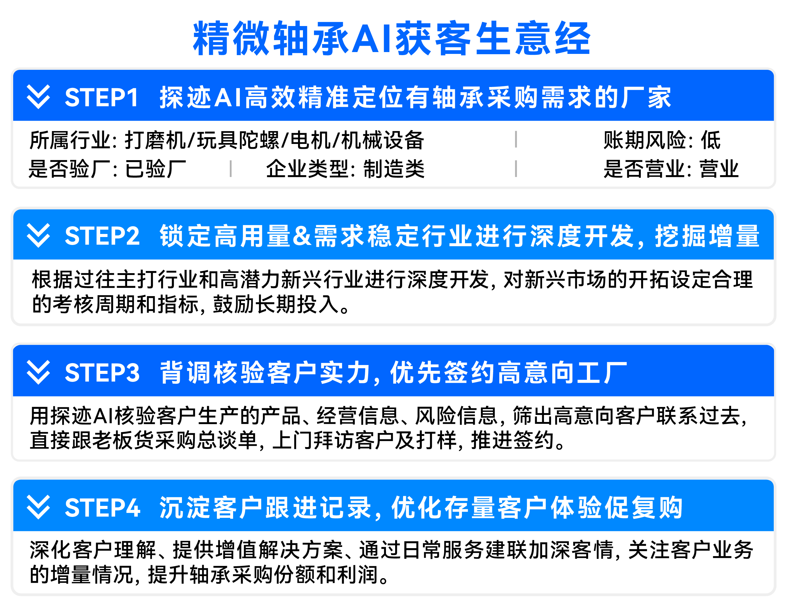 轴承——设备运转的精密“关节”,即使日常生活中的摄像头、玩具陀螺都得用上轴承,它更是机械工业不可或缺的“运转核心”。近年来轴承国产化替代加速,利好涌现,一批轴承终端工厂使用AI实现业绩提升。宁波市精微轴承制造有限公司每月通过探迹AI开发出增量十几家客户,借政策与需求东风,找到规模化增量市场并深度扎根。让我们一起走进这家有20年历史的轴承工厂,聆听创始人邓总的生意经。