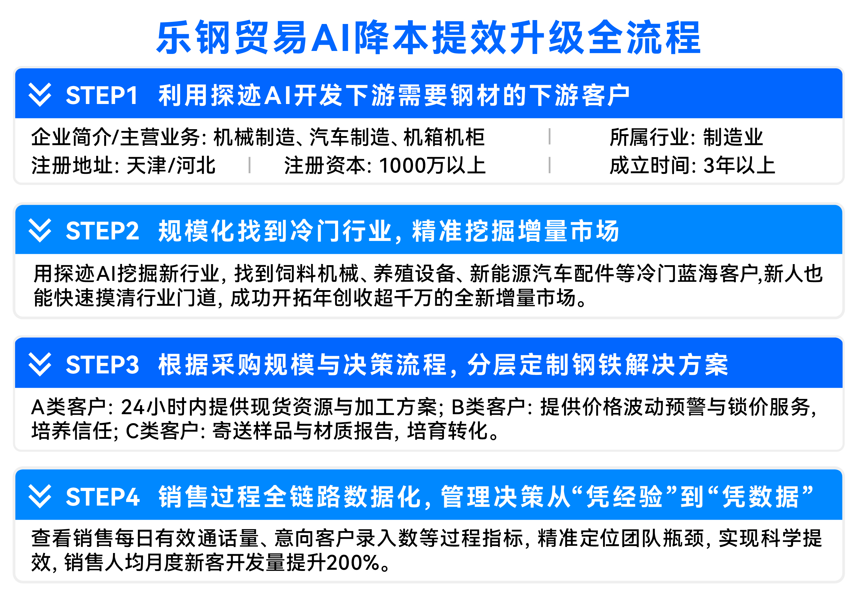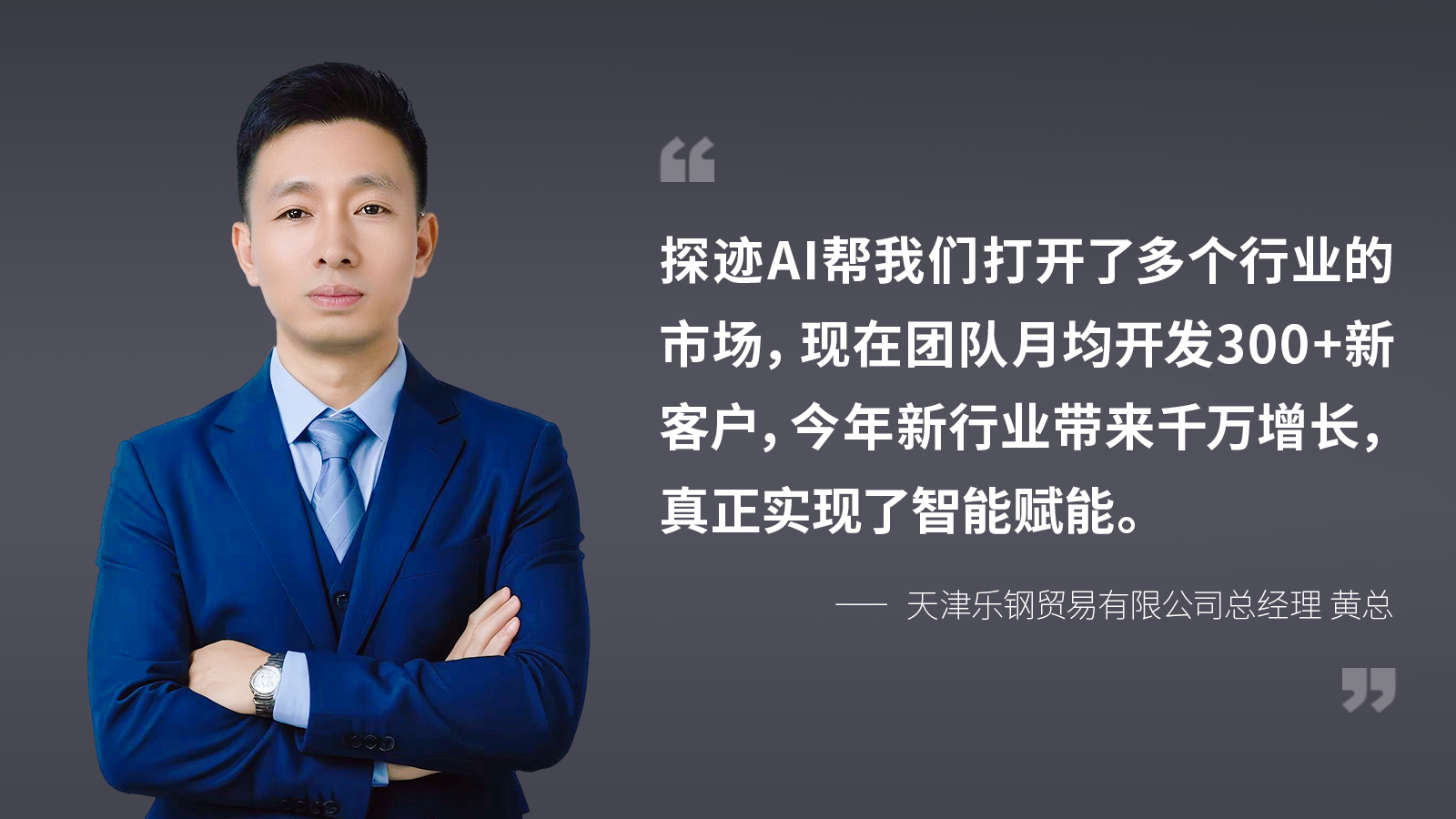 踏实,也来自技术带来的确定性。“以前开发新客户像摸黑走路,现在用探迹AI筛选客户池,销售知道该给谁打电话,该聊什么产品。” 最让黄总惊喜的是,通过AI赋能,乐钢竟然成功打入了完全陌生的行业领域。