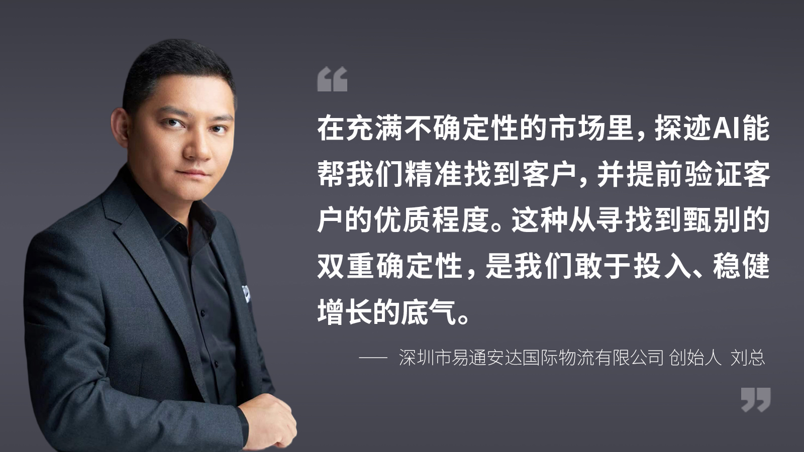 “跨境物流正走向更合规、更高质量的发展阶段,对服务商的信息化能力提出了极高要求。从内部操作系统到客户体验都在接入AI,降低对人的依赖,提高效率,从而构建自己的护城河。”谈到未来,刘总有着清晰的规划。他坦言,易通安达的愿景是成为世界级综合物流解决方案专家。