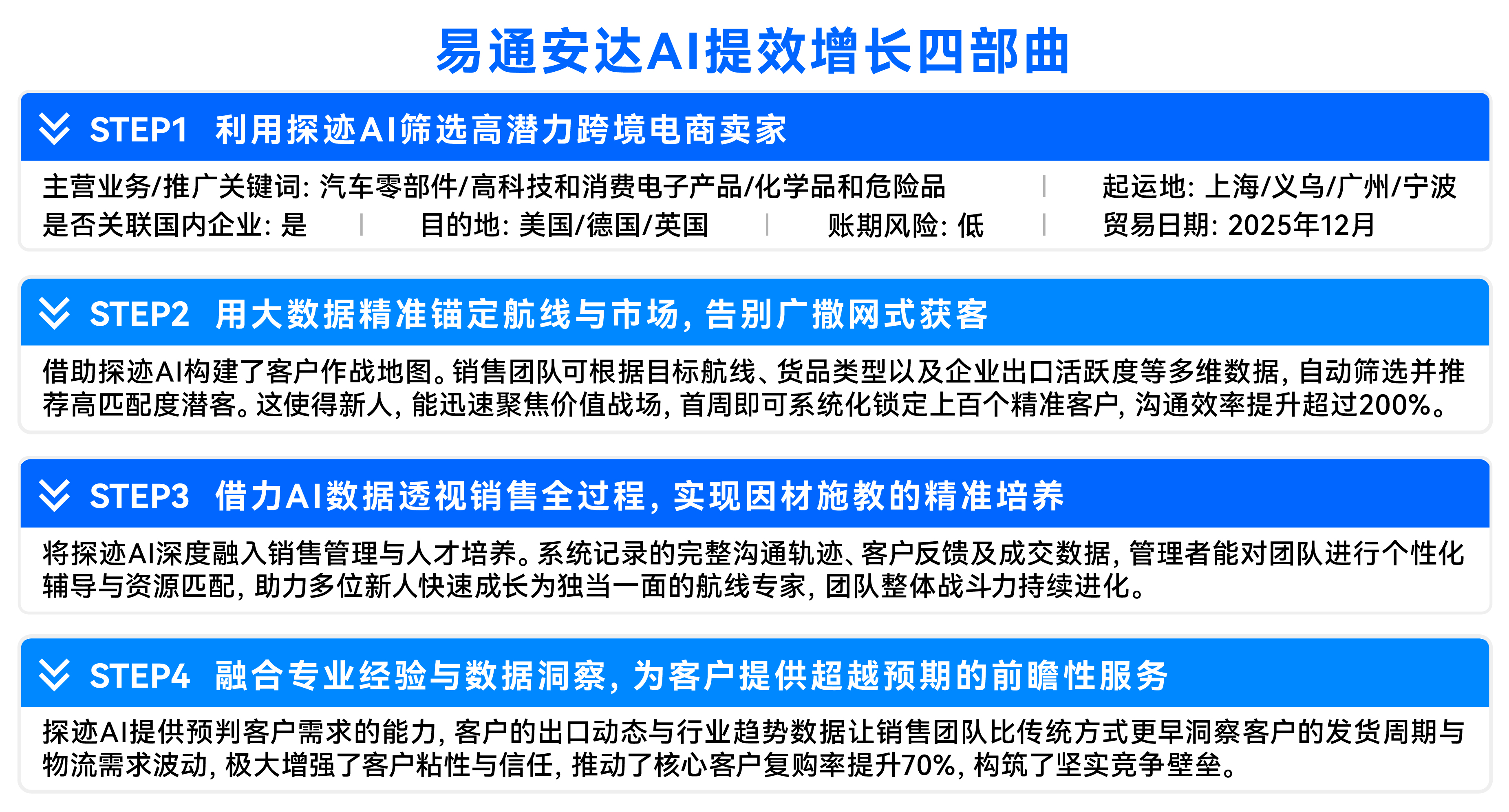 “当他了解到宁波一家月出口额超百万美金的小家电工厂是我们的目标客户时,他的沟通方式彻底变了。”孙总回忆道,“他不再是泛泛而谈,而是开场就能基于数据,为客户的高货值产品量身设计防损、防震的专项物流方案。这种基于精准情报的专业对话,让他迅速赢得了信任,并成功签单。