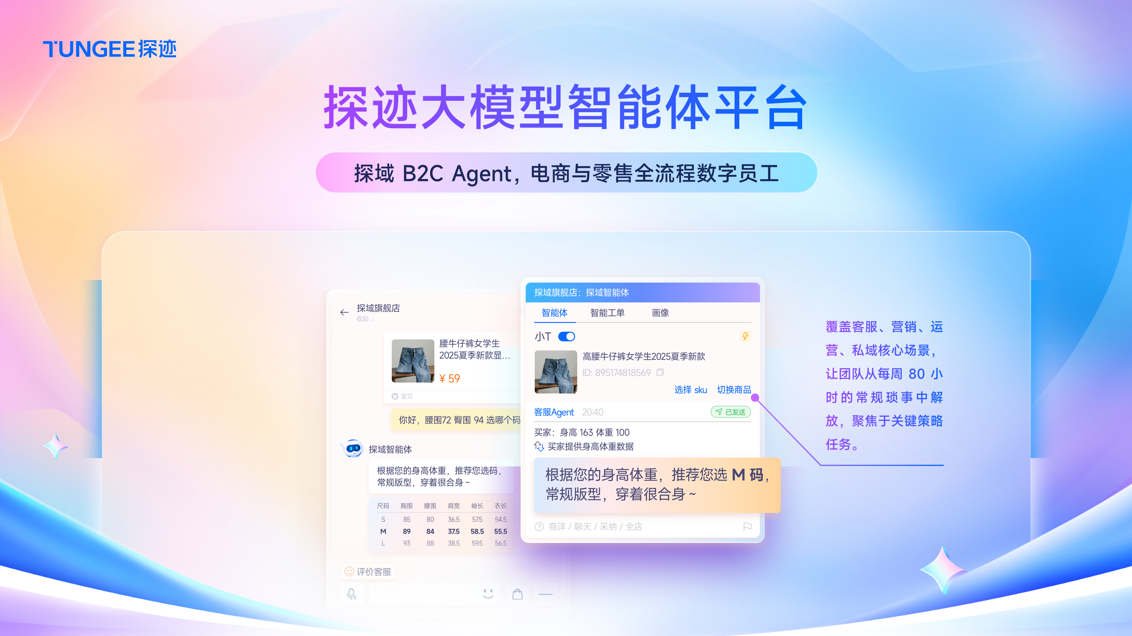 面向电商与零售企业,探迹科技提供覆盖了电商和零售B2C企业的客服、营销、运营、私域等核心场景的B2C Agent组合,从前端营销获客到中端销售转化,再到后端交付服务与长期客户价值挖掘的全链路赋能。