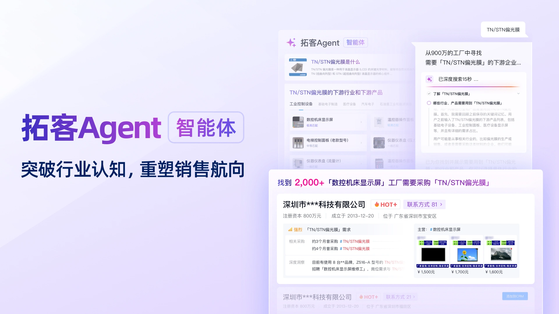 输入您的产品名称,即可推荐高质量潜客,精准适配各行业,高效触达海量厂商及渠道客群,实现全面精准获客。