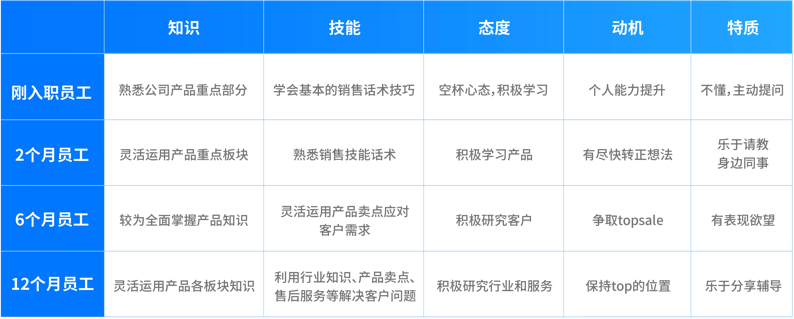 ①刚入职,公司为其准备入职培训,了解公司、熟悉产品,掌握基本销售技能;