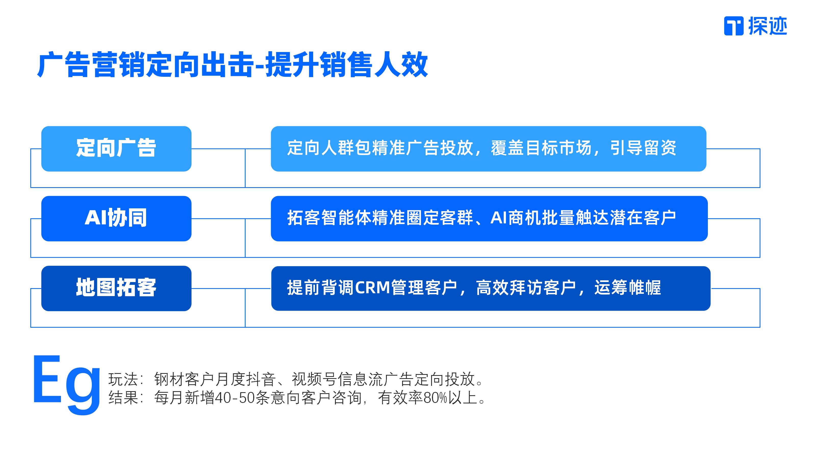 线上渠道包括腾讯系、字节系的广告,百度SEM等。定向广告,能直接圈定符合理想客户画像的定向人群包,实现精准广告触达。她分享了一个佛山钢材客户的案例:该客户从百度转向抖音、腾讯信息流广告,使用人群包后,线索有效率从20%提升到60%-80%,获客成本从100-150元降至70元左右。