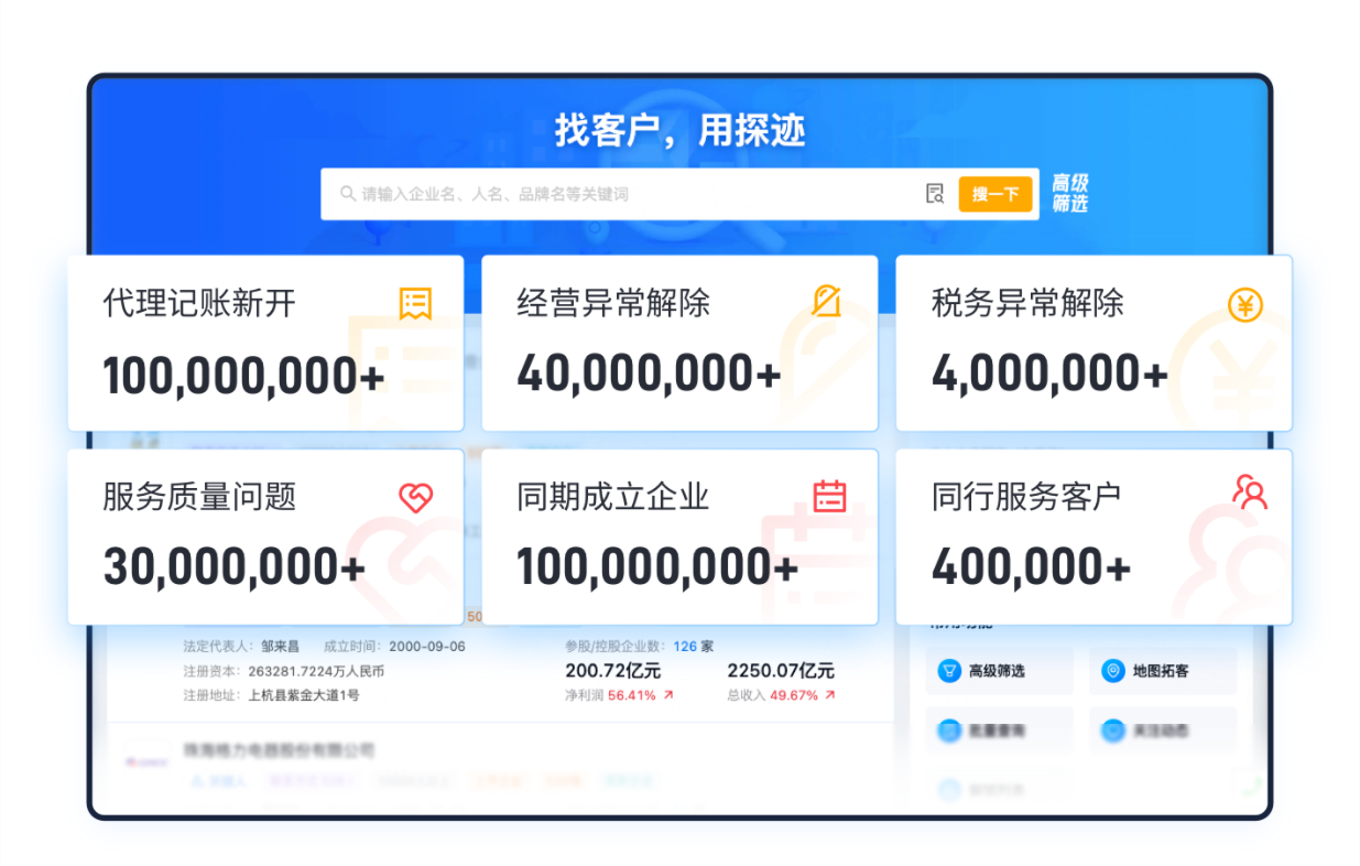 优点:现在市面上有很多查询企业信息的平台,例如探迹拓客平台根据行业分类推出了探迹拓客-工商财税版,这里面包含代理记账新开、经营异常解除、税务异常解除、服务质量问题、同期成立企业、同行服务客户等6大核心客群,对于财税公司无论是常见业务开展,还是同行切户,都能轻松找到,帮助财税业务员快速找到目标客户。