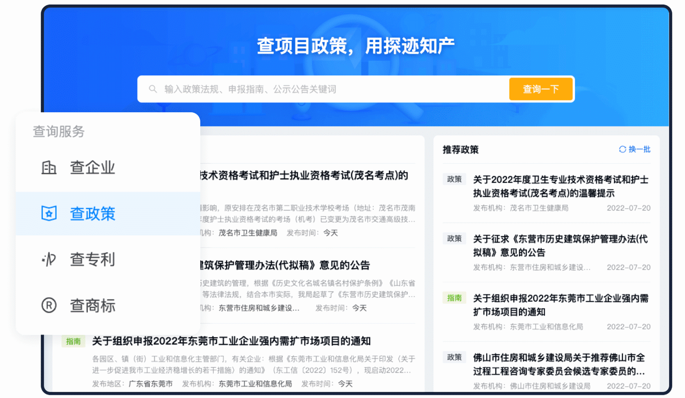 此外,平台整合了政策、专利、商标等关键信息的一站式查询,用户无需在多个网站间切换,即可全方位掌握目标企业的知识产权布局和政策申报基础,为后续沟通提供有力支撑。