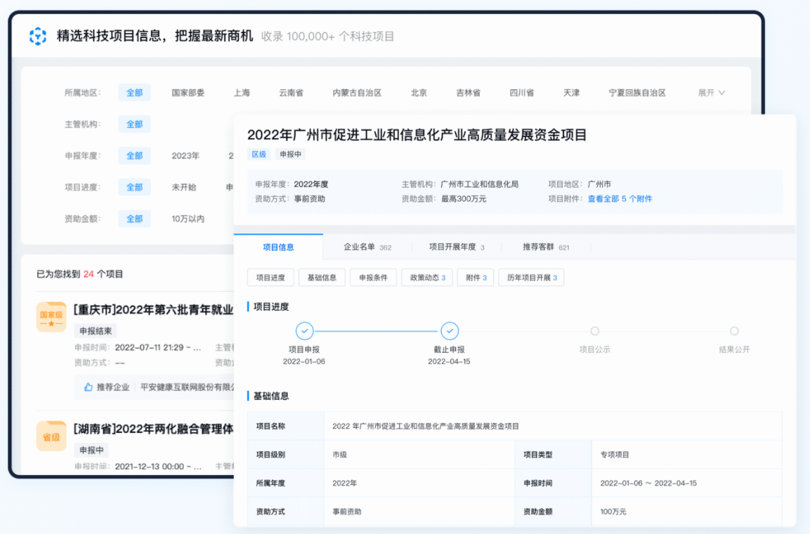 探迹拓客知识产权版深度整合了海量、精准的企业数据(如覆盖超20万家高新企业、50万家+科技项目相关企业等),并具备一站式查询政策、专利、商标等信息的能力。