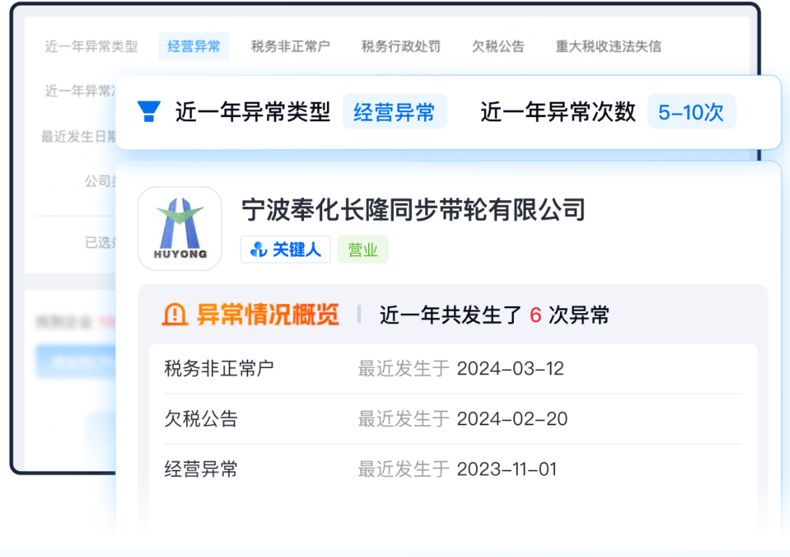 精准定位“非正常户”客群:直接筛选“非正常户”状态企业,区别于其他经营异常。