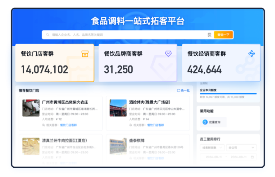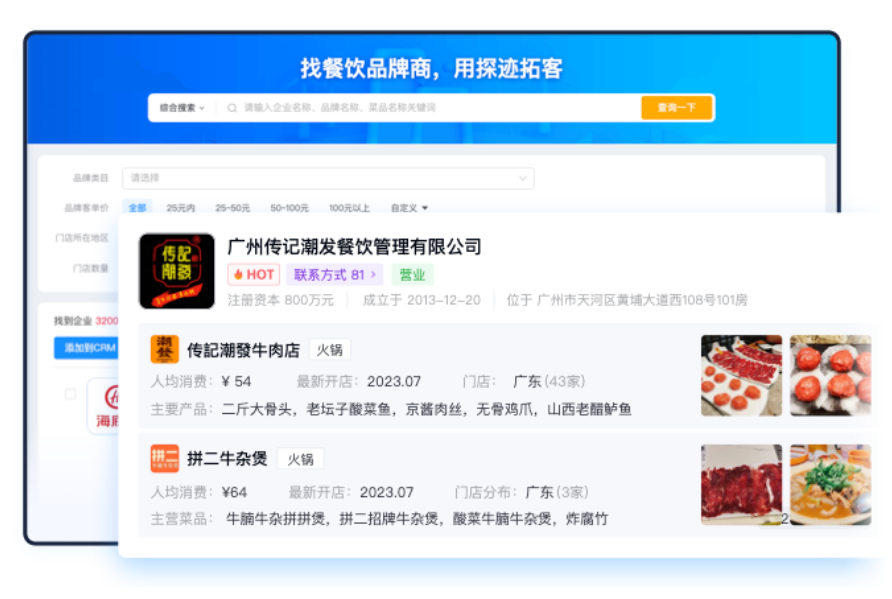 一键直达目标:只需输入你所关注的冷冻食品品类、目标餐饮品牌(如火锅连锁、快餐品牌)或关联电商平台,探迹便能基于海量数据,一键筛选出与之匹配的餐饮经销商线索,省去大海捞针之苦。