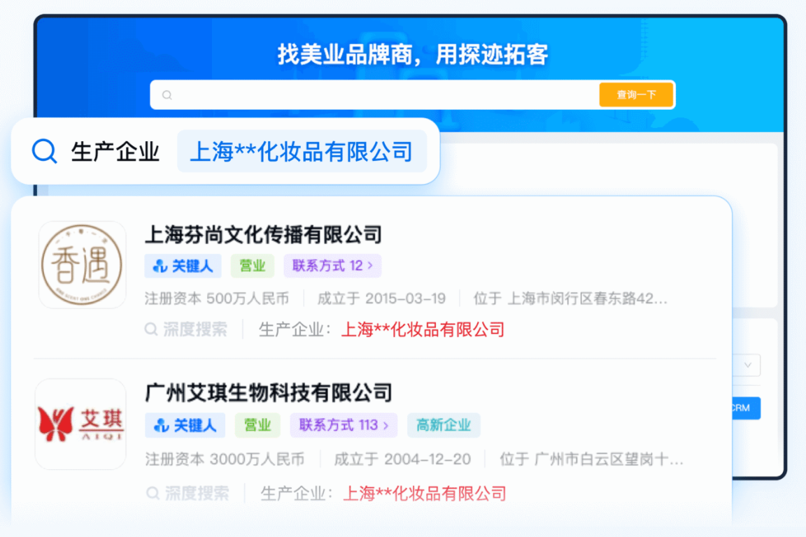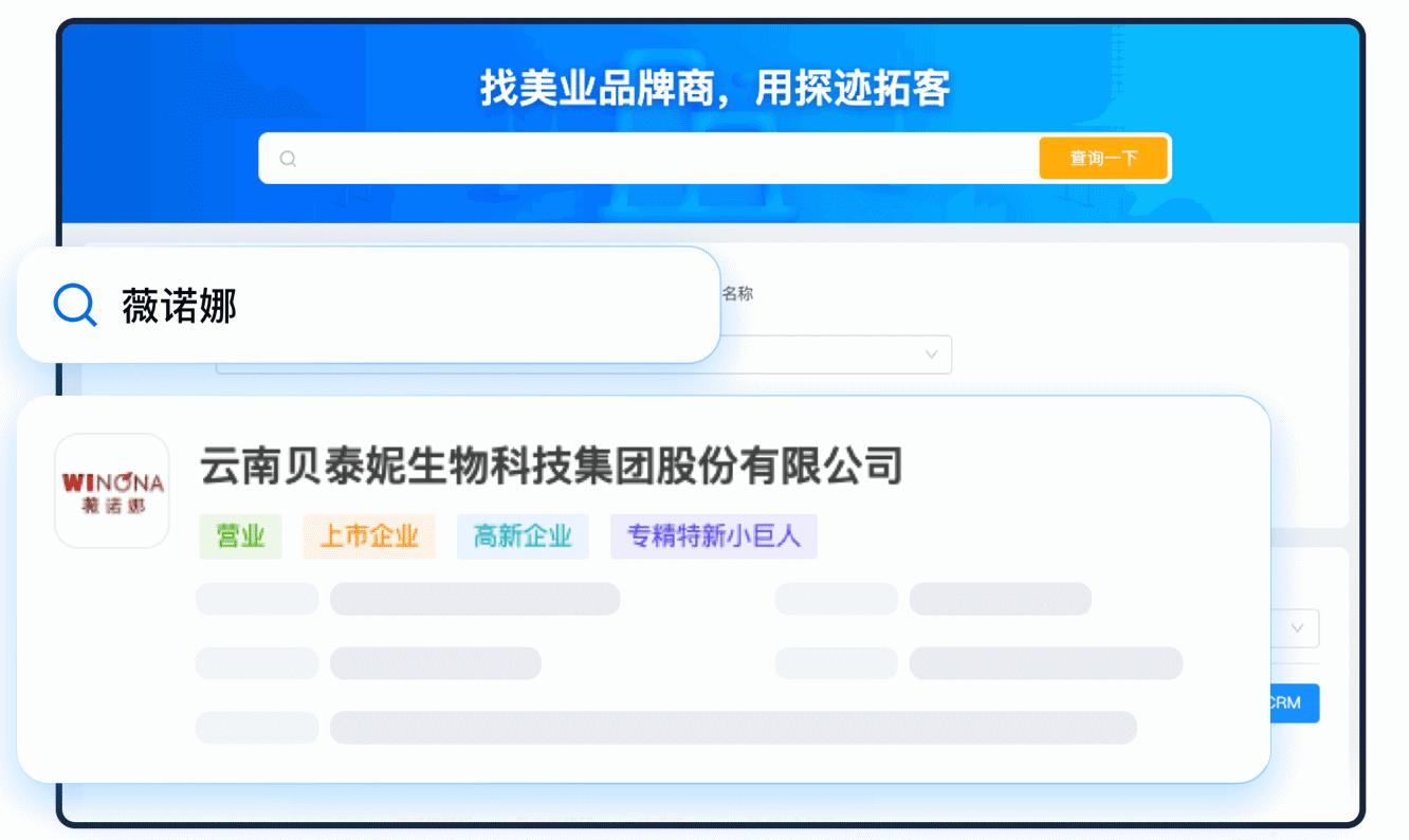 人工收集名单常面临信息滞后、筛选低效等痛点,尤其难捕捉连锁店实时扩店计划或供应链调整动态(如某品牌突然更换区域供应商)。要打破这种信息差,需借助数字化工具—「探迹拓客美业版」系统可快速解决这一问题:输入产品功效(如“抗衰精华”)、区域关键词(如“华东”),即可: