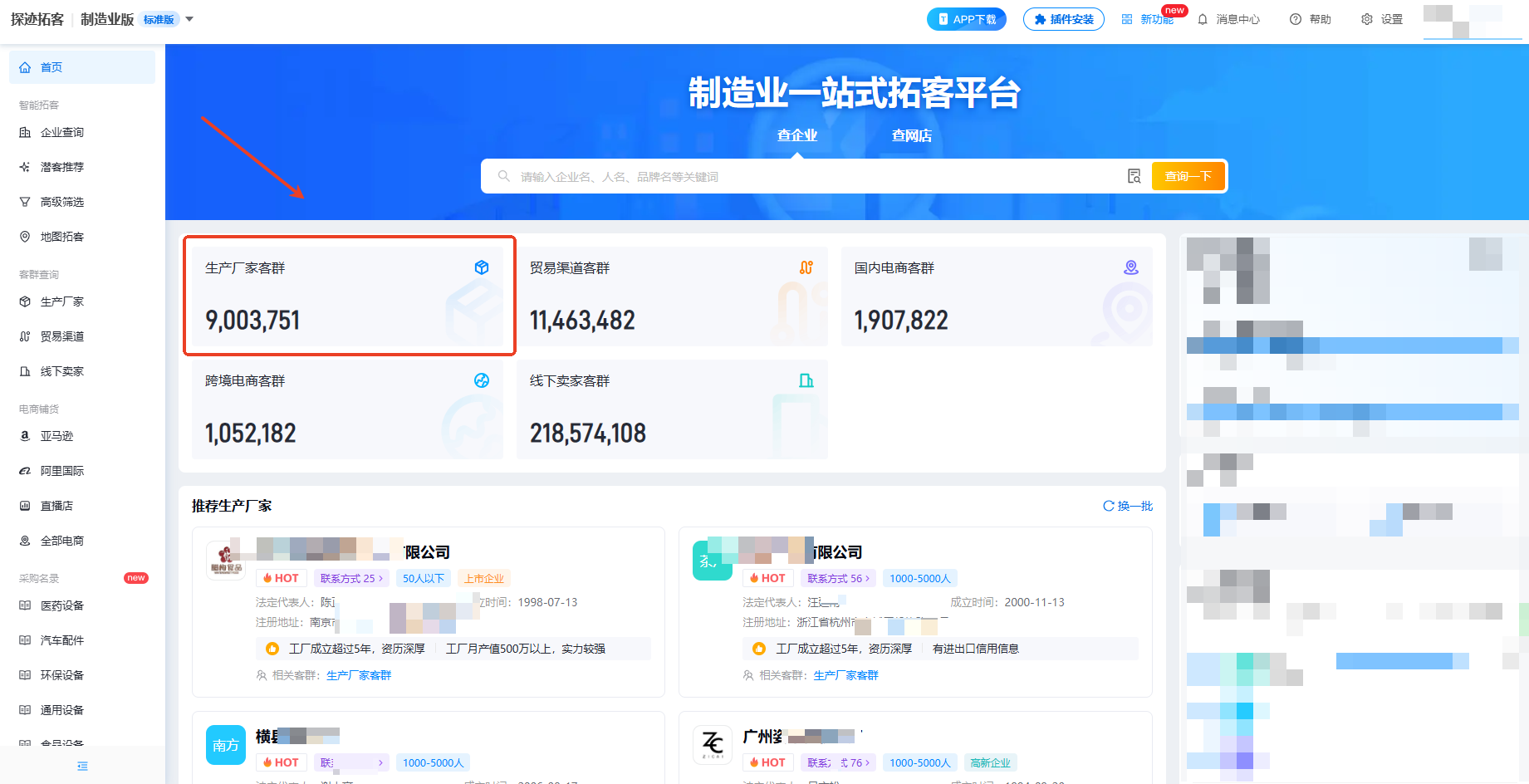 在探迹拓客机械设备版首页选择“生产厂家”客群,系统拥有超900w的企业信息