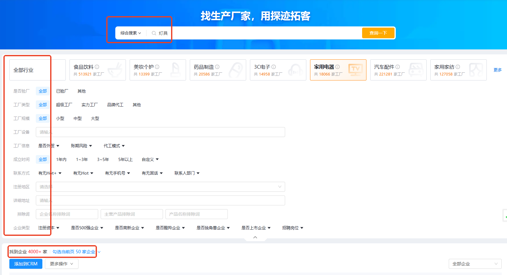 在系统的综合搜索框里面输入相关产品的名称,例如“灯具”,还可以根据“是否验厂”,工厂类型,工厂规模等条件进行筛选,筛选出更精准的目标客户,系统会根据设置条件筛选符合的企业
