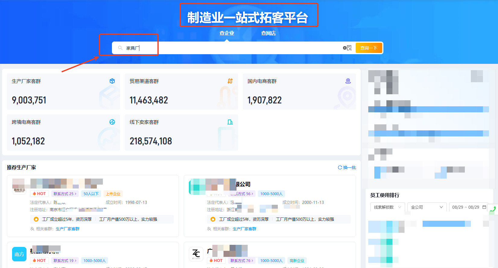 1、登录探迹拓客制造业版,在首页的搜索框输入“家具厂”