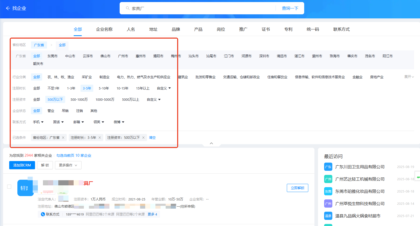 3、如果你想跟进一步查找符号条件的精准客户,可以在利用系统的筛选条件进行精准查找。例如“广东-注册资本<500w”的家具厂