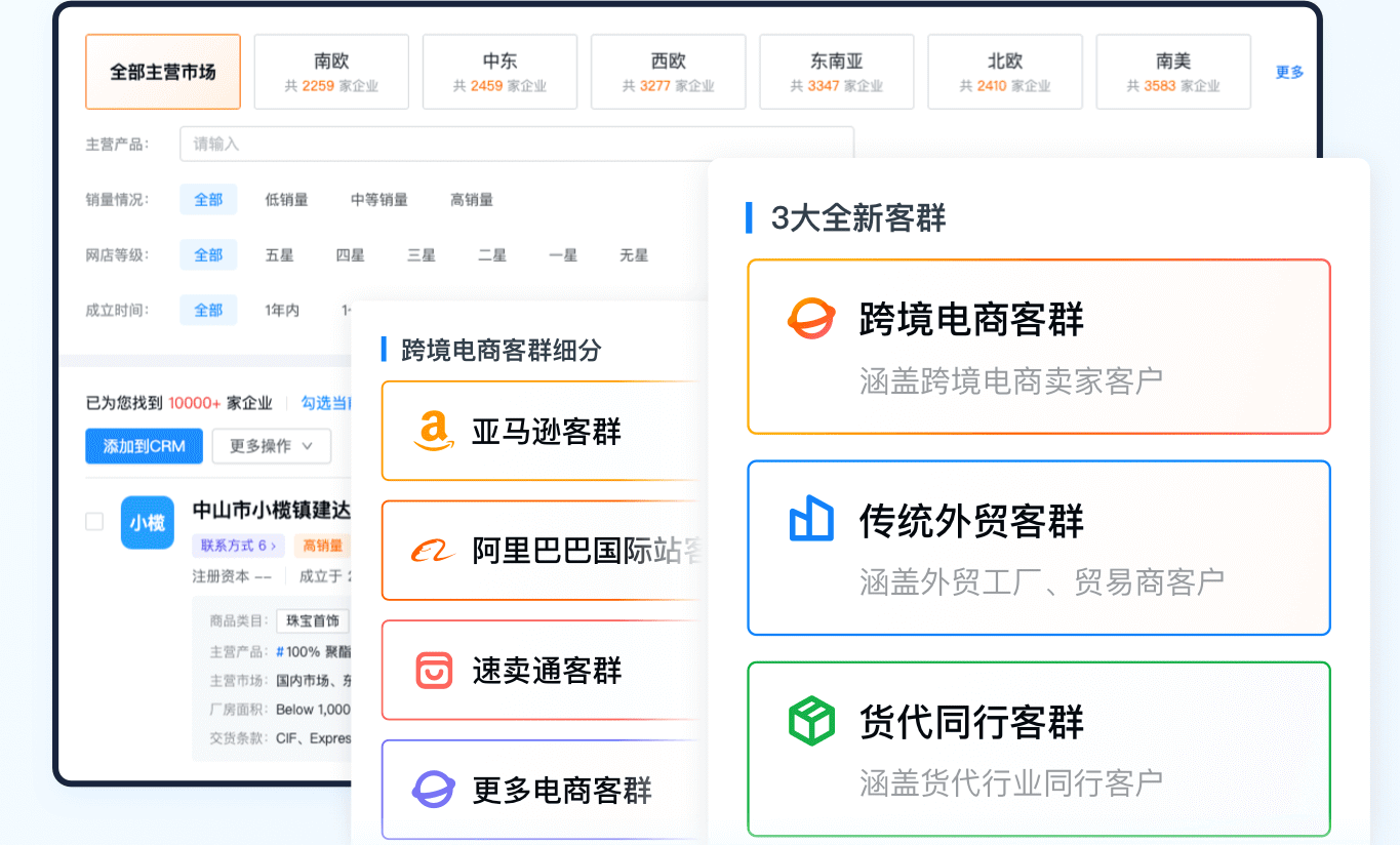 跨境电商客群:精准覆盖亚马逊(230,288+)、阿里巴巴国际站(306,336+)、速卖通(526,441+) 等主流平台商家,百万级优质卖家线索触手可及。