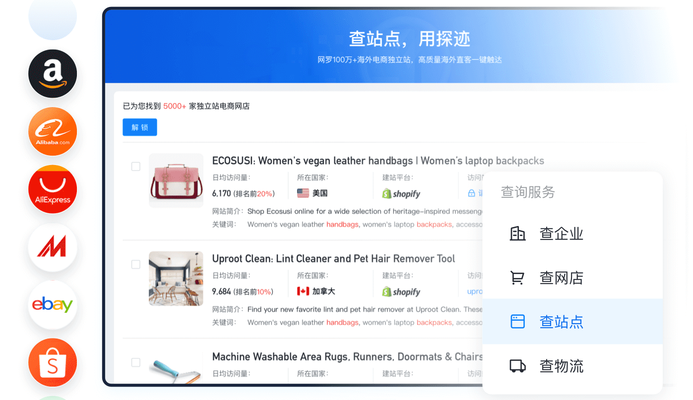 查询网店/独立站:一键查询目标卖家的店铺销量排名、月均访问量等关键数据,真实评估其业务状况,告别盲目跟进。