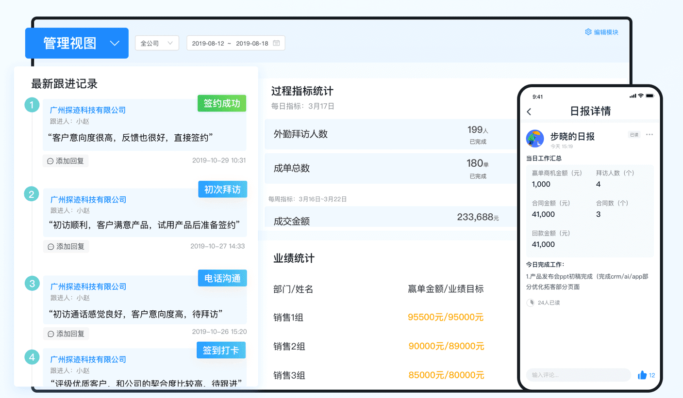 全程记录:管理客户档案、记录跟进情况(如外勤拜访)、监控跟进过程。