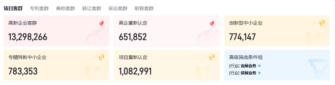 内置全国专精特新企业数据库,实时更新,覆盖高新企业、科技项目、专利代理、商标代理等10个核心客群,帮助您快速锁定目标客户群体
